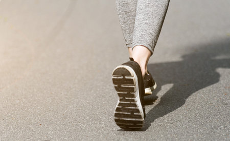 A person is walking along an asphalt path with white directional arrows and the word walk painted on it. The image uses a low-angle perspective, showing the feet and legs of the person. The style has a natural aesthetic. The photograph might be suitable for various commercial and editorial applications, focusing on lifestyle and fitness concepts.