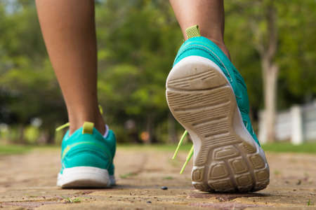 Close up of running shoes in motion on a path with blurred background for stock photography use