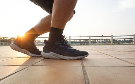 Close up legs and black shoes of runner man running with sprint on the road during sunrise.Outdoor in the public park concept.