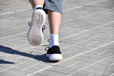 Close-up of a person's shoe while walking. Suitable for accompanying articles about the walking benefits, articles recommending places to walk for exercise, posting pictures with quotes about walking