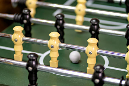Close up of vintage football table, soccer table. Leisure Equipment, Soccer Ball
