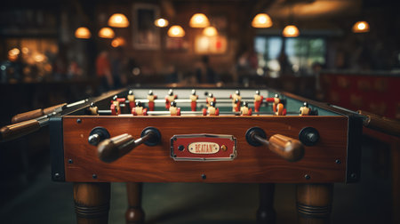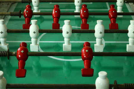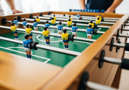 Close-up of players on a table football game (foosball), symbolizing competition, teamwork, and leisure activity.