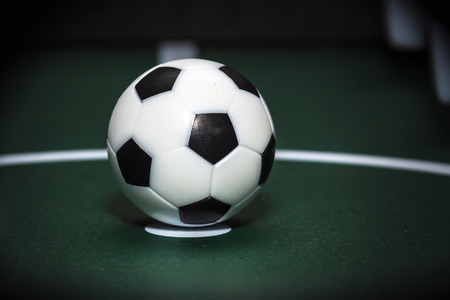 Foosball, closeup of a mini table football game with an old white and black soccer ball, selective focus. Generative Ai.