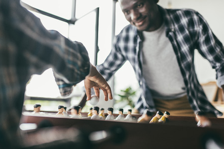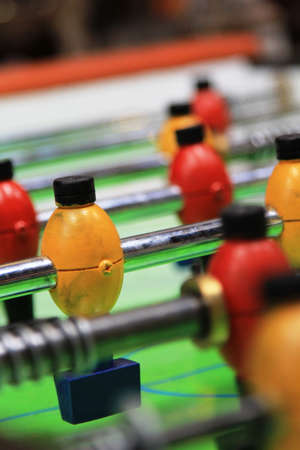 Close up on players of Table football soccer kicker foosball top-table game playing
