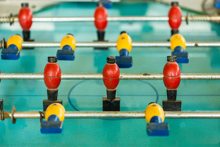 Foosball table soccer. Team sport, table football players game. Competitive table game