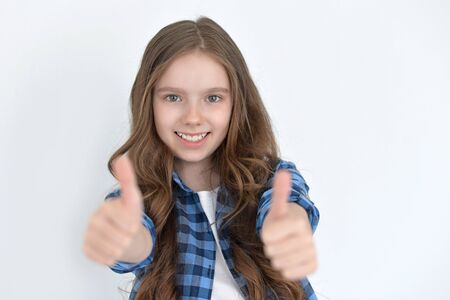 Just amazing. Happy child with long curly hair on blue background. Small child smiling with beauty look. Brunette female child with long wavy hairstyle. Cute little child wearing casual style