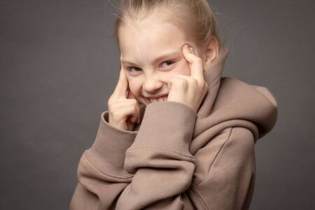 hild-girl with long hair gathered in a bun. In Hoodies. holds the hood with his hands. laughs and rejoices. Portrait close-up