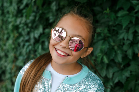 Stylish little girl child wearing a summer or autumn clothes, sunglasses outdoor