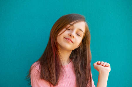 Portrait of a cute teenage girl on a turquoise background. Girl in a pink dress.