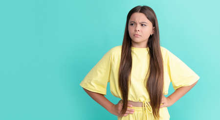 teen beauty hairstyle. express positive emotion. haircare and skincare. hairdresser. Child face, horizontal poster, teenager girl isolated portrait, banner with copy space.