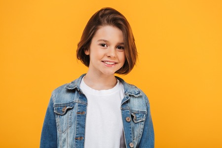 Little girl. Small child on yellow background. Child care concept. Preteen girl smiling expression. Childrens shop store mall. Goods for teens. Adorable girl beautiful face. Upbringing and education