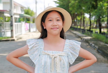 Smiling young girl in straw hat and light blue dress is standing outdoors with her hands on her hips on suburban street.