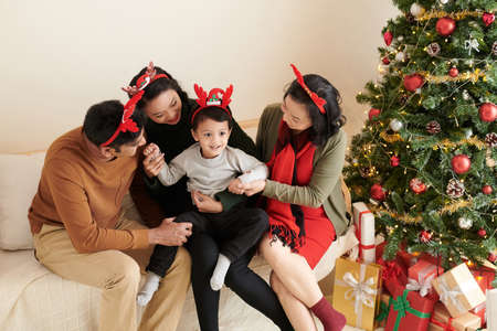 Cheerful parents and grandmother playing with happy little kid when spending time at home on Christmas