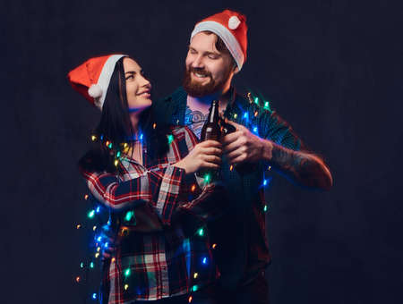 Couple in santa hats, new year, christmas. Lovers in neon light. Surprised couple looking to the side at empty space for text