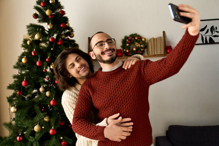 Two men happily capture a joyful moment together at home, surrounded by holiday decorations.