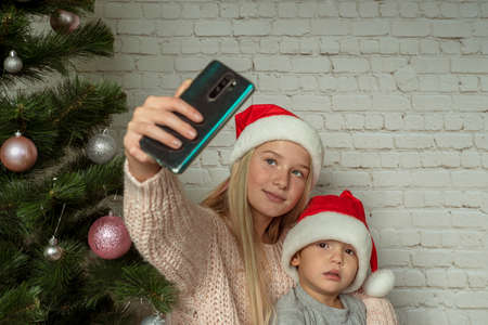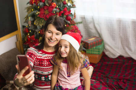 Mom and daughter are sitting near the Christmas tree, hugging, taking photos and selfies on the phone, communicating via video communication, having fun. Christmas, new year's eve at home. Copy space