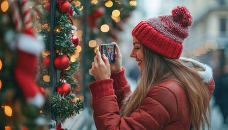 Young woman is taking pictures with her smartphone of a house decorated for christmas with garlands and illuminated at night