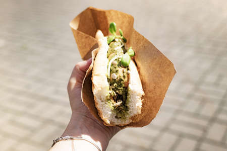 Vegan, vegetarian hot dog with soy sausage in female hand at a street festival