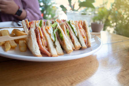 women hand pick Sandwich with ham, cheese, tomatoes,,