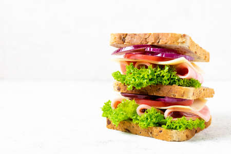sandwich with ham cheese tomatoes lettuce onions. Multi-layer sandwich with whole grain bread on white background with copy space