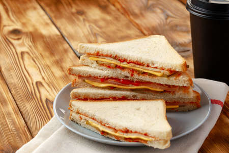 Tasty and fresh sandwiches on a dark wooden background, close-up