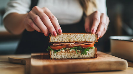 a sandwich with tomatoes and lettuce, presented on a dark turquoise and dark white background. the wooden surface adds a functional aesthetic to the image. captured in 8k resolution, this photograph showcases the precisionist details of the sandwich. the overall composition exudes a bombacore vibe. ai generated