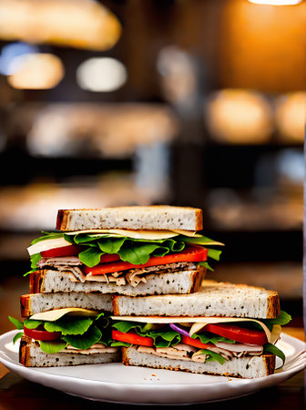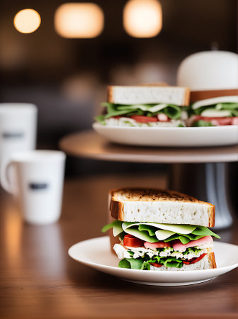 Realistic sandwich neutral colors warm lighting detailed cozy atmosphere no people in a restaurant setting. Generative AI Generated