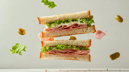 A visually appealing sandwich featuring layers of meat and crisp lettuce, suspended mid-air. Ideal for showcasing fresh ingredients and meal ideas.