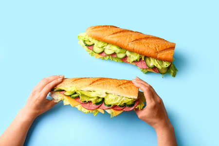 Female hands with tasty sandwiches on color background