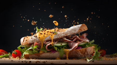 A sandwich with lettuce, tomatoes and cheese being tossed in the air, AI