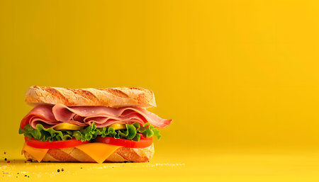A close-up shot of a delicious ham and cheese sandwich on a bright yellow background.