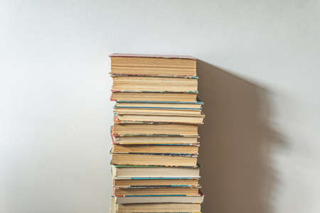 Stack of colorful books. An open book on a stack of books. The concept of education, international book day, success. Book, hardback colorful books on table. Education business concept.
