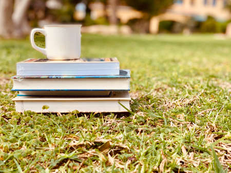 education and self-improvement, stack of books shot from eye level with shallow depth of field