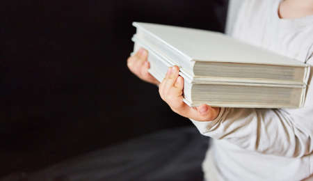 Top view of the books. Paper publications stacked on a pile. Dark background.