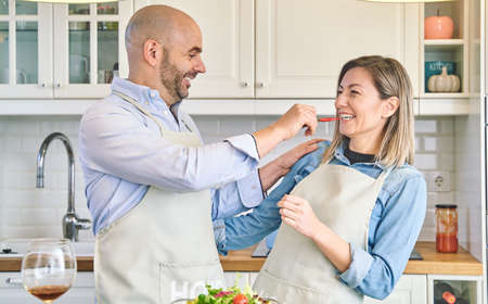 Happy couple cooking at home. He offers her a chili pepper. Family kitchen concept.