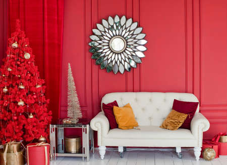Interior with red Christmas tree, sofa, vintage mirror, lights and decorations