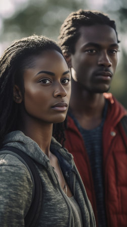 Sideways shot of serious black teenage girl and man wear casual vests take break in open air have self confident facial expressions prepare for sport competitions Healthy : Generative AI