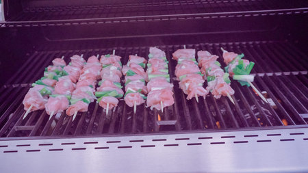 Step by step. Raw chicken yakitori skewers on outdoor gas grill.