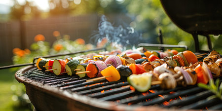 Vibrant grilled skewers featuring colorful vegetables and succulent meat over a charcoal fire, exuding delicious aromas and a summer vibe perfect for outdoor gatherings.