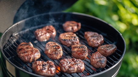 Detailed view of smoke emerging from a barbecue grill, with sizzling food and a smoky atmosphere