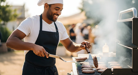 A joyful man grilling barbecue in a sunny outdoor setting, showcasing delicious food and a vibrant atmosphere.