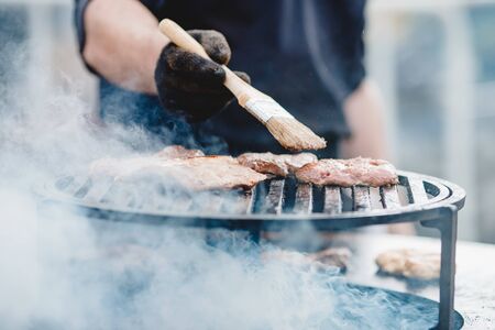 Cook grills steaks and pork ribs open fire. Turns meat over with tongs. Street food concept