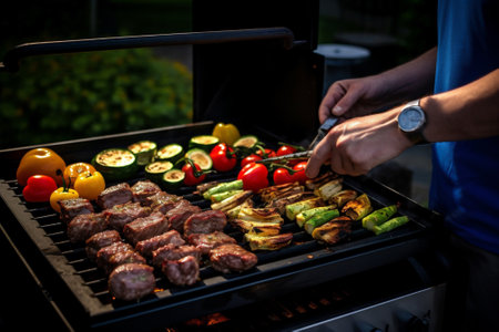 Unrecognizable man grilling meat and vegetable on grill during family summer garden party, close-up