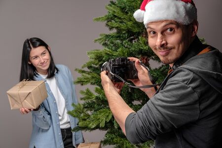 A young guy in a Christmas cap is filming on a mirrorless camera as a young girl with black hair is wrapping Christmas presents. Shooting for blog and vlog. Social Media Videos and Photos. DIY concept