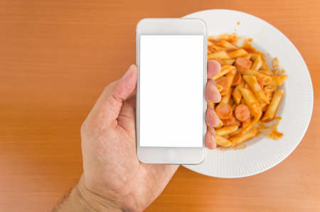man holding smartphone making food photography to the meal at the table
