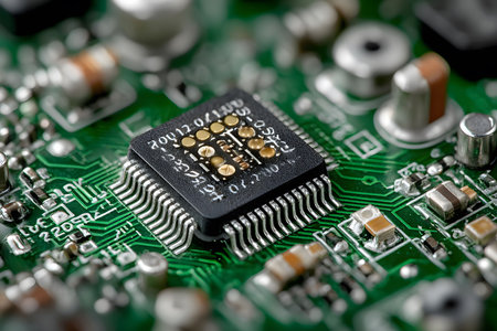 Close-up of electronic circuit board with microchips and transistors