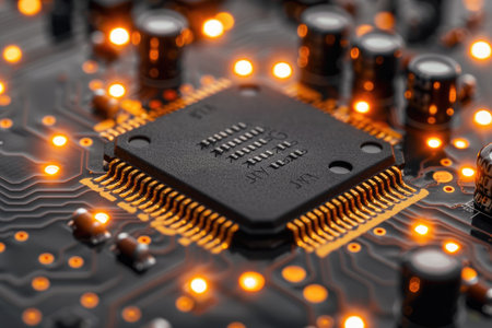 Close-up view of advanced electronic circuit board featuring a central microchip surrounded by intricate circuitry and various components. The vibrant colors enhance the futuristic aesthetic.