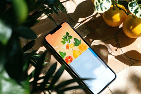 Bright and refreshing citrus vibes illuminate the smartphone screen amidst cozy shadows and greenery. Perfect blend of nature and technology. Generated A.I.