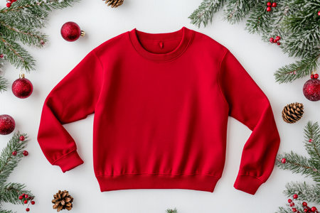 A vibrant red sweater rests on a crisp white background, elegantly adorned with charming Christmas decorations, evoking warmth and festive cheer.