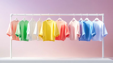 A vibrant arrangement of colorful casual clothing hung on a white rack against a soft pastel background, ideal for fashion marketing or retail displays.